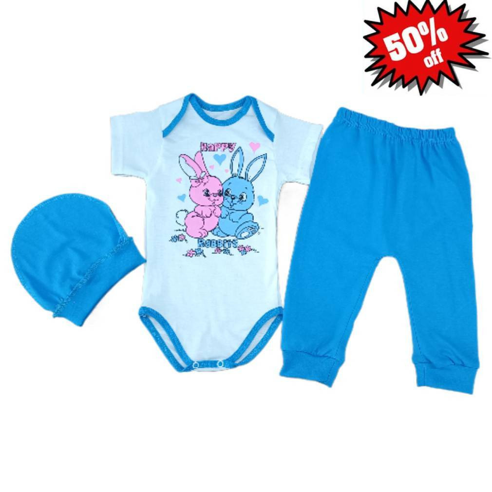 Комплект ясельний (боди короткий рукав+штани+шапка) для хлопчика "Зайчики"